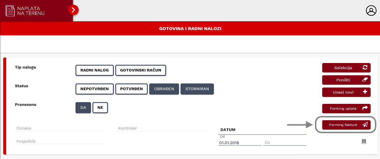 Prijenos u knjigovodstvo se pokreće klikom na gumb Formiraj fakture.